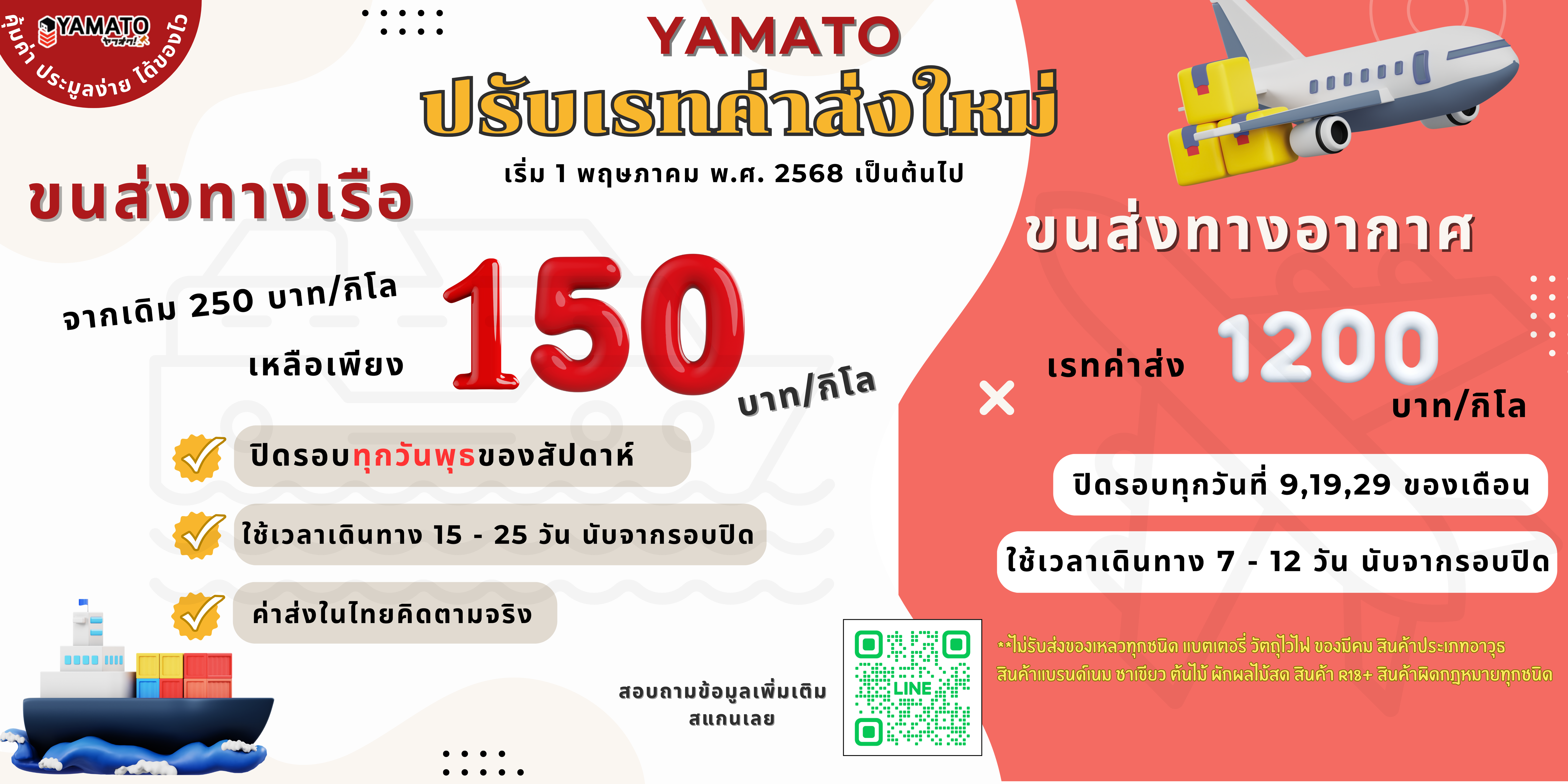 ทาง YAMATO ขอแจ้งการปรับเรทค่าส่ง ค่าบริการ และรอบเรือใหม่